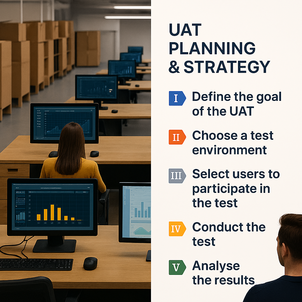 We start by developing a detailed UAT strategy tailored to your organisation’s complexity, regulatory requirements and deployment model.